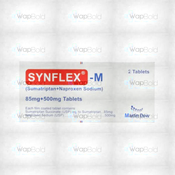 Experience quick and effective relief from migraines and pain with Synflex-M Tablets. Each box contains one strip, which includes two tablets. This powerful combination of sumatriptan (85mg) and naproxen sodium (550mg) works to alleviate migraine symptoms and reduce inflammation, making it an ideal solution for managing acute to chronic pain. Always use under the guidance of a healthcare professional.